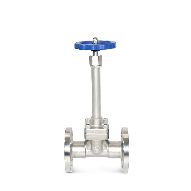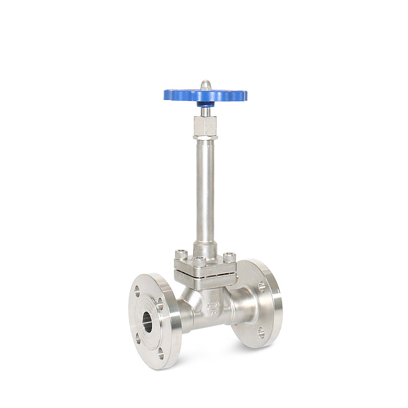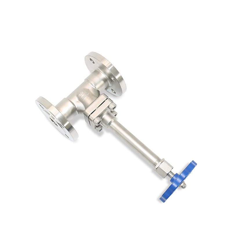 The valve adopts a bolted bonnet, one-piece valve seat, replaceable PTFE/PCTFE gaskets, and stainless steel internal components. The valve base is designed with a conical shape for easy tight closing. The bolted bonnet is more convenient for maintenance, especially in narrow spaces, as the torque required for disassembly is much smaller than that of valves with one-piece bonnets of the same specification. Cryogenic Long-Stem Globe Valves with flanged ends are used at the liquid outlet and inlet of cryogenic storage tanks. Due to the extremely low temperature of the medium in the cryogenic storage tank, the temperature can easily transfer to the top of the handle in a short time. Therefore, cryogenic long-stem globe valves with flanged ends are adopted for pipelines in areas with large contact area with cryogenic liquids.